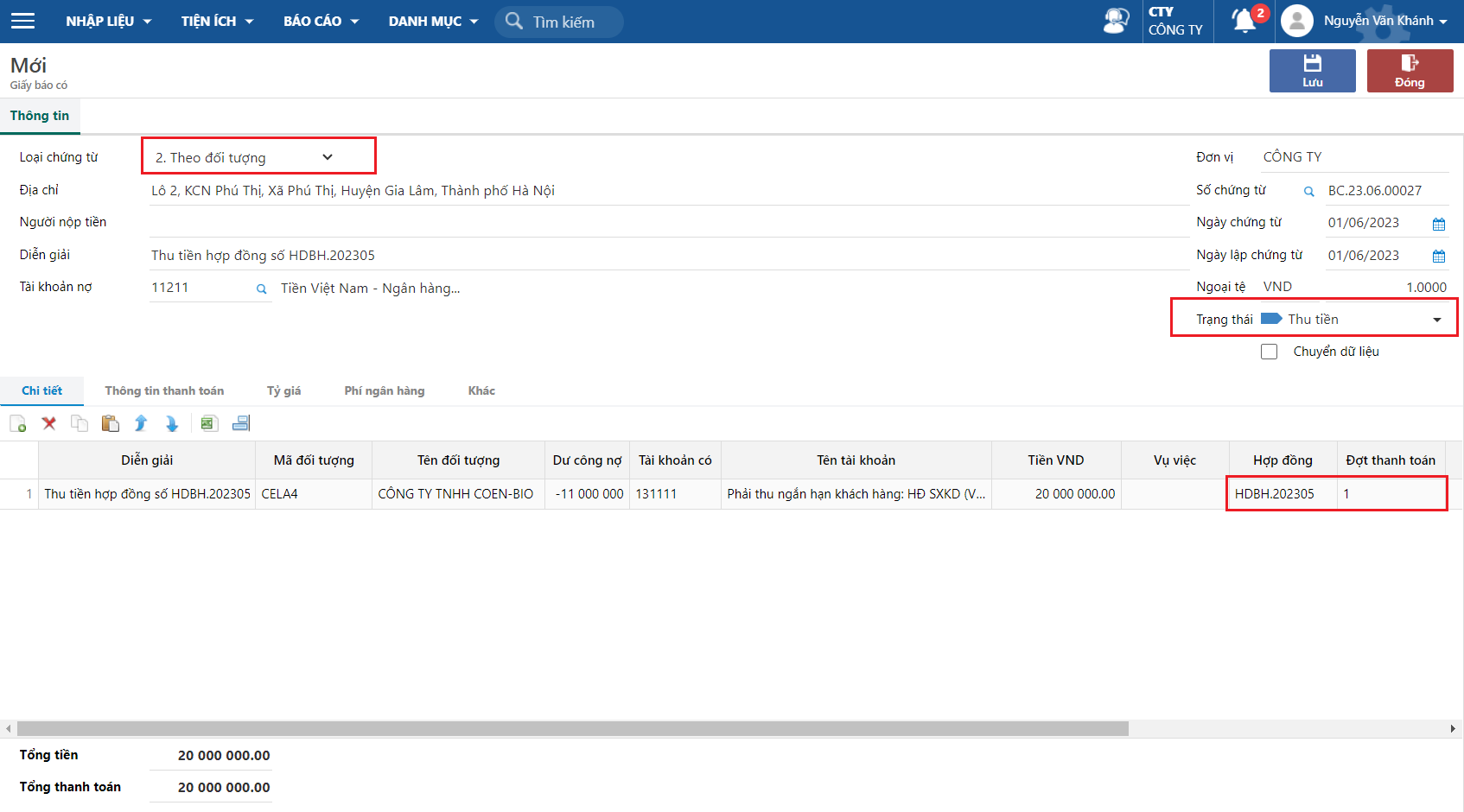### Thu tiền thanh toán từng đợt theo hợp đồng