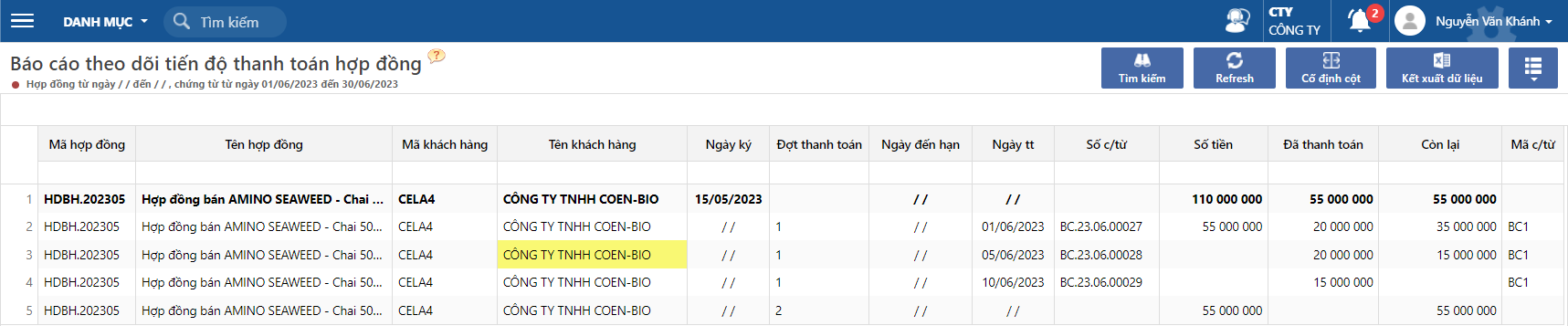 ### Kiểm tra báo cáo tiến độ thanh toán theo hợp đồng