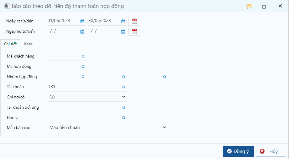 * Tài khoản, Ghi nợ/có: khi chọn tài khoản tại đây chương trình sẽ lấy phát sinh của tài khoản ở điều kiện lọc, không nhập sẽ lọc tất cả phát sinh của tài khoản. Để xem thu tiền hợp đồng bán, người dùng chọn **tài khoản 131, ghi có.**