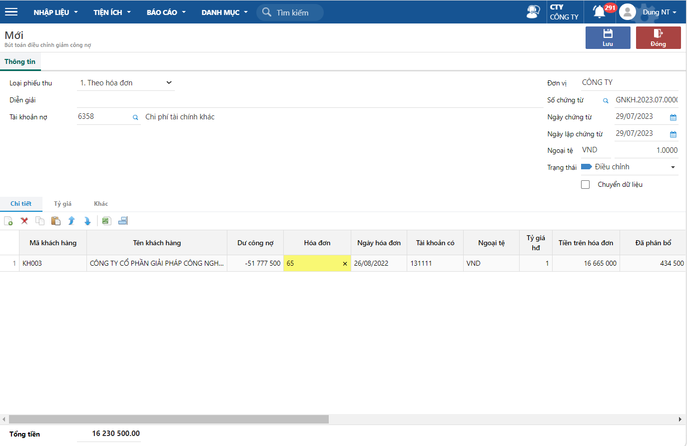 * Khai báo thông tin: diễn giải, tài khoản nợ, số chứng từ, ngày chứng từ, trạng thái,...