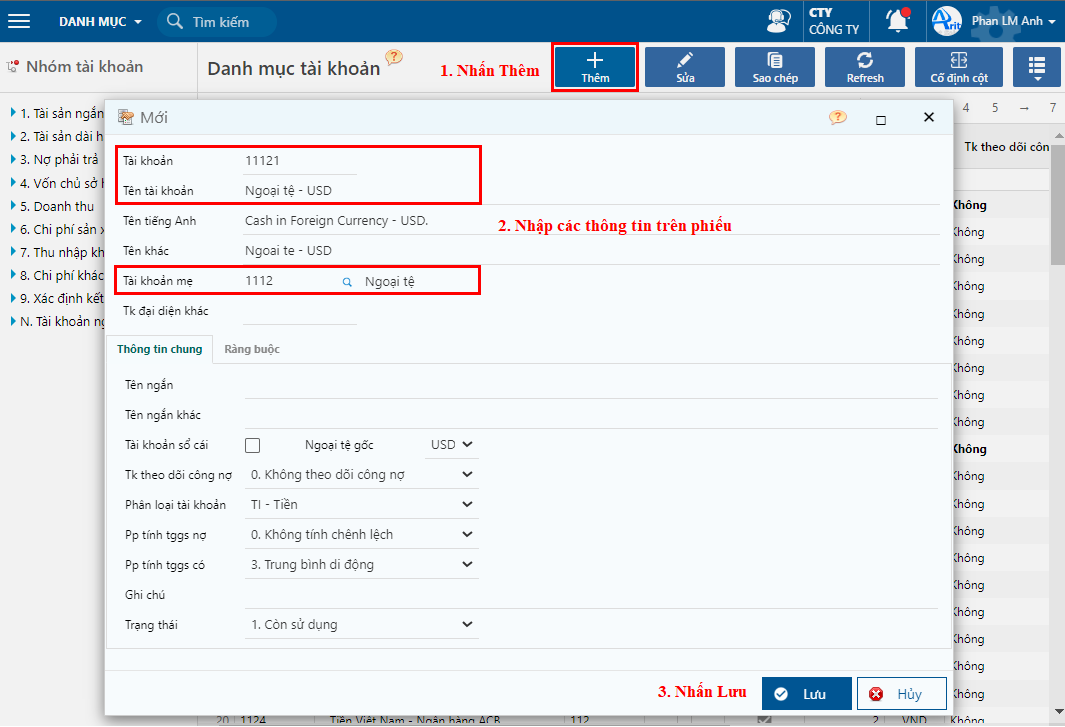 **Bước 3:** Nhập các thông tin khai báo tài khoản và nhấn **Lưu.**
