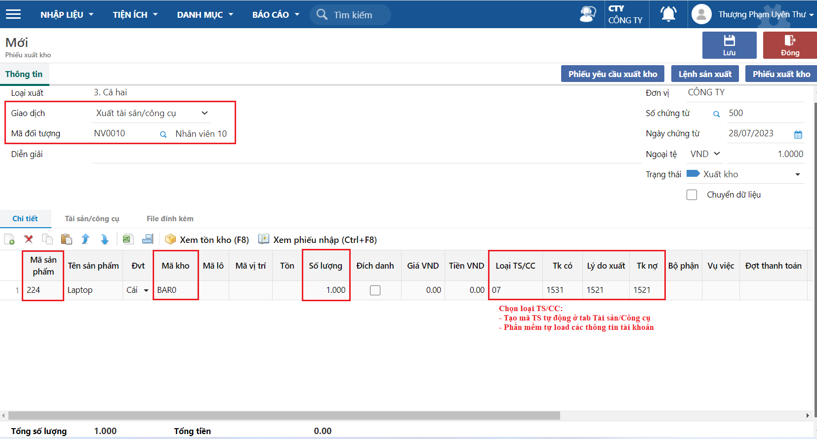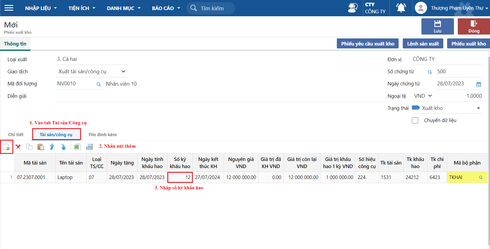 Tạo tại phiếu xuất kho ở tab Tài sản/ Công cụ