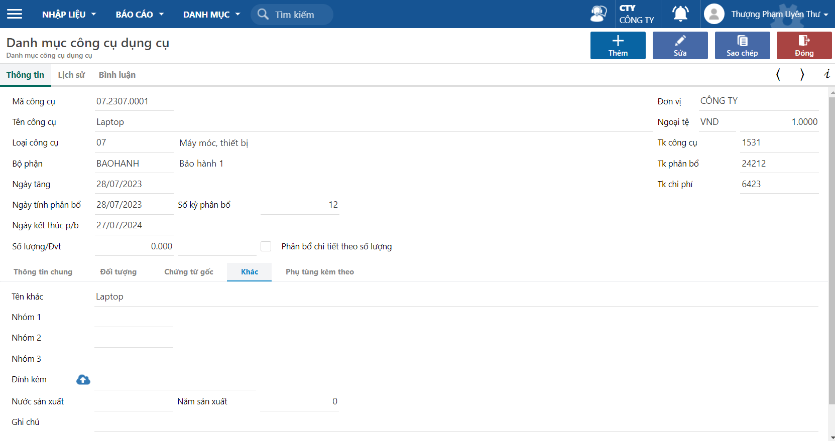 **Bước 5:** Tạo thông tin CCDC và kiểm tra thông tin công cụ dụng cụ