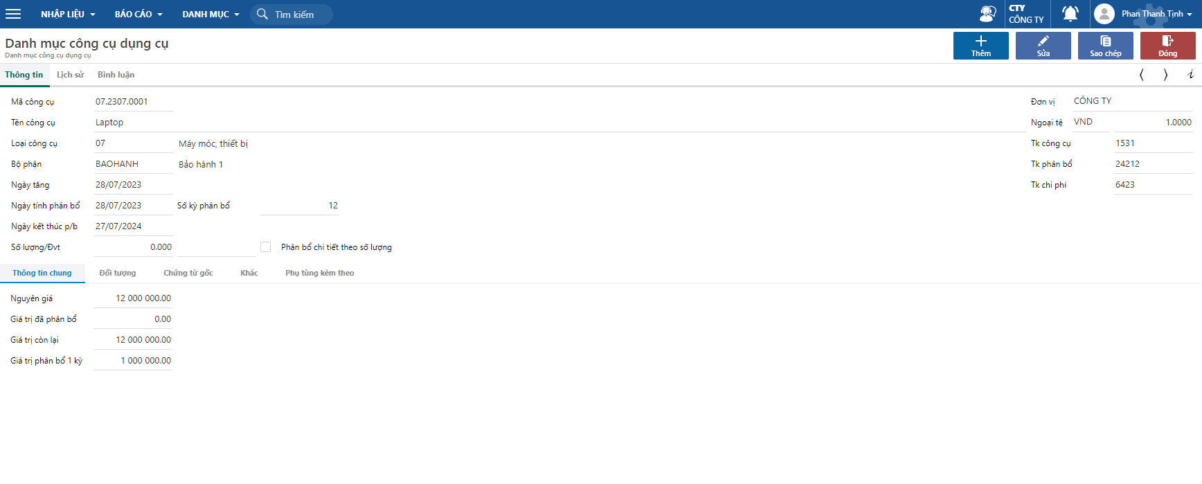* Khi nhấn nút thêm mới, hệ thống sẽ tự sinh mã công cụ theo mẫu tự động và hiện các thông tin đã nhập bên tab chi tiết.
