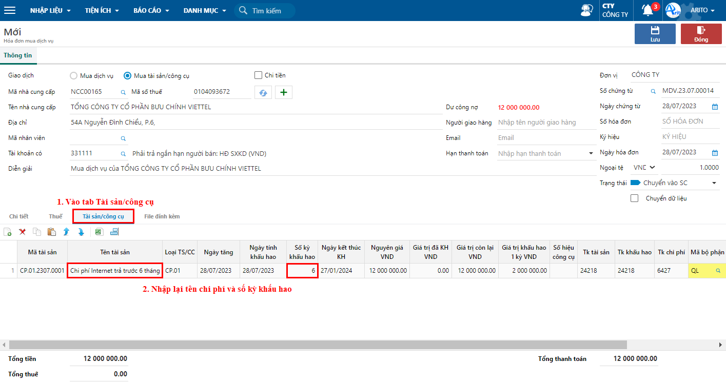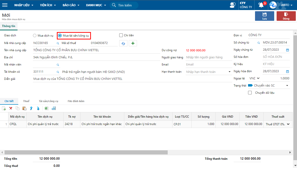 * Ở phần thông tin: chọn Giao dịch: Mua tài sản/công cụ, nhập mã nhà cung cấp, tài khoản có, diễn giải.