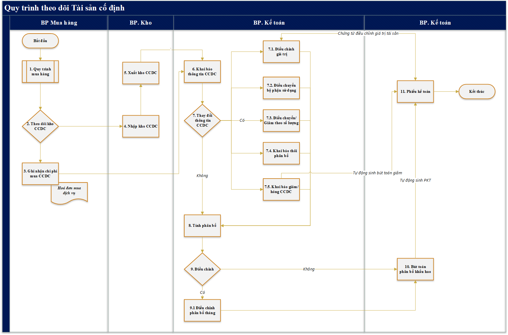 <table data-header-hidden><thead><tr><th width="93">Bước</th><th width="207">Tên thao tác</th><th width="332">Chi tiết</th><th>Hướng dẫn</th></tr></thead><tbody><tr><td><strong>1</strong></td><td><strong>Quy trình mua hàng</strong></td><td>Thực hiện mua CCDC tham chiếu theo quy trình mua hàng</td><td><a href="khai-bao-thong-tin-cong-cu-dung-cu/mua-ccdc-ve-dua-vao-su-dung-ngay">Tại đây</a></td></tr><tr><td><strong>2</strong></td><td><strong>Theo dõi kho CCDC</strong></td><td>Bước này người dùng xác định phương thức theo dõi CCDC có theo dõi tồn kho hay không. Nếu có theo dõi tồn kho chuyển sang bước (4), nếu không chuyển sang bước (3)</td><td><a href="khai-bao-thong-tin-cong-cu-dung-cu/quy-trinh-mua-ccdc">Tại đây</a></td></tr><tr><td><strong>3</strong></td><td><strong>Ghi nhận chi phí CCDC</strong></td><td><p>Trường hợp CCDC không theo dõi tồn kho, người dùng thao tác hạch toán chi phí tăng CCDC thông qua hoá đơn mua dịch vụ.</p><p>Bước này thực hiện tương tự đối với ghi nhận Chi phí trả trước phân bổ nhiều kỳ.</p></td><td><a href="khai-bao-thong-tin-cong-cu-dung-cu/mua-ccdc-ve-dua-vao-su-dung-ngay">Tại đây</a></td></tr><tr><td><strong>4</strong></td><td><strong>Nhập kho CCDC</strong></td><td>Trường hợp CCDC có theo dõi tồn kho. Người dùng tiến hành ghi nhận phần nhập mua mới thông qua hoá đơn mua hàng trong nước/nhập khẩu</td><td><a href="khai-bao-thong-tin-cong-cu-dung-cu/quy-trinh-mua-ccdc">Tại đây</a></td></tr><tr><td><strong>5</strong></td><td><strong>Xuất kho CCDC</strong></td><td>Khi có nhu cầu xuất dùng CCDC, người dùng tiến hành xuất kho CCDC</td><td><a href="khai-bao-thong-tin-cong-cu-dung-cu/quy-trinh-mua-ccdc">Tại đây</a></td></tr><tr><td><strong>6</strong></td><td><strong>Khai báo thông tin CCDC</strong></td><td><p>Khi công cụ được đưa vào sử dụng, người dùng phải khai báo thông tin tài sản để theo dõi.</p><p>Bước này có 2 nguồn hình thành:</p><p>- Hình thành từ hoá đơn mua dịch vụ (Bước 3)</p><p>- Hình thành từ Phiếu xuất kho xuất dùng CCDC (Bước 5)</p></td><td></td></tr><tr><td><strong>7</strong></td><td><strong>Thay đổi thông tin CCDC</strong></td><td><p>Nếu có nhu cầu thay đổi thông tin, giá trị Công cụ, người dùng thực hiện các bước chi tiết (7.1, 7.2, 7.3, 7.4, 7.5)</p><p>Nếu không, người dùng chuyển sang bước (8)</p></td><td><a href="dieu-chinh-dieu-chuyen-ccdc/dieu-chinh-thong-tin-cong-cu-dung-cu-khi-chua-co-phan-bo">Tại đây</a></td></tr><tr><td><em><strong>7.1</strong></em></td><td><strong>Điều chỉnh giá trị CCDC</strong></td><td><p>Khi có nhu cầu điều chỉnh giá trị công cụ người dùng thực hiện bước này.</p><p>Lưu ý: Bước này thực hiện đồng thời kèm các chứng từ hạch toán kế toán điều chỉnh giá trị CCDC</p></td><td><a href="dieu-chinh-dieu-chuyen-ccdc/dieu-chinh-gia-tri-cong-cu-dung-cu">Tại đây</a></td></tr><tr><td><em><strong>7.2</strong></em></td><td><strong>Điều chuyển bộ phận</strong></td><td>Khi có nhu cầu điều chuyển giữa các bộ phận nhằm chuyển mục đích sử dụng hoặc chuyển quyền quản lý CCDC, người dùng thực hiện bước này</td><td><a href="dieu-chinh-dieu-chuyen-ccdc/dieu-chuyen-bo-phan-su-dung-ccdc">Tại đây</a></td></tr><tr><td><em><strong>7.3</strong></em></td><td><strong>Điều chuyển/ Giảm theo số lượng CCDC</strong></td><td>Bước này thực hiện khi đơn vị theo dõi công cụ theo số lượng. Thao tác cho phép người dùng điều chuyển hoặc khai báo giảm một phần số lượng CCDC đang theo dõi.</td><td><a href="broken-reference">Tại đây</a></td></tr><tr><td><em><strong>7.4</strong></em></td><td><strong>Khai báo thôi phân bổ</strong></td><td>Dùng để khai báo công cụ không còn giá trị sử dụng hoặc không được phân bổ đưa vào chi phí nữa.</td><td><a href="dieu-chinh-dieu-chuyen-ccdc/khai-bao-thoi-phan-bo-ccdc">Tại đây</a></td></tr><tr><td><em><strong>7.5</strong></em></td><td><strong>Khai báo giảm công cụ</strong></td><td><p>Dùng trong trường hợp công cụ hết giá trị sử dụng hoặc công cụ bán thanh lý, hư hỏng</p><p>Lưu ý: Khai báo này sẽ tự động sinh Phiếu kế toán hạch toán giá trị còn lại của tài sản vào chi phí khác.</p></td><td><a href="broken-reference">Tại đây</a></td></tr><tr><td><strong>8</strong></td><td><strong>Tính phân bổ</strong></td><td>Bước này được thực hiện hàng kỳ nhằm tính toán giá trị phân bổ kỳ của các công cụ, chi phí trả trước</td><td><a href="tinh-phan-bo-cong-cu-dung-cu/cac-buoc-tinh-khau-hao-va-phan-bo-hang-ky">Tại đây</a></td></tr><tr><td><strong>9</strong></td><td><strong>Điều chỉnh</strong></td><td><p>Khi có nhu cầu điều chỉnh lại giá trị đã tính phân bổ ở bước (8), người dùng thực hiện điều chỉnh ở bước (9.1)</p><p>Nếu không, người dùng chuyển sang bước (10)</p></td><td></td></tr><tr><td><em><strong>9.1</strong></em></td><td><strong>Điều chỉnh phân bổ tháng</strong></td><td>Chức năng dùng để điều chỉnh lại giá trị phân bổ tháng, khi chạy bút toán hạch toán chỉ ghi nhận giá trị sau điều chỉnh vào chi phí phân bổ</td><td><a href="tinh-phan-bo-cong-cu-dung-cu/cac-buoc-tinh-khau-hao-va-phan-bo-hang-ky">Tại đây</a></td></tr><tr><td><strong>10</strong></td><td><strong>Bút toán phân bổ</strong></td><td>Tiện ích này giúp người dùng tạo tự động bút toán hạch toán giá trị phân bổ đã tính ở bước (8) hoặc giá trị sau điều chỉnh ở b