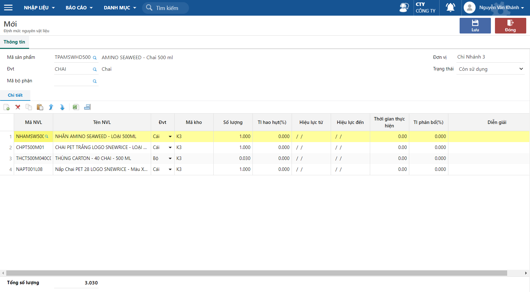 * Số lượng: số lượng nguyên liệu cần đủ để sản xuất sản phẩm.