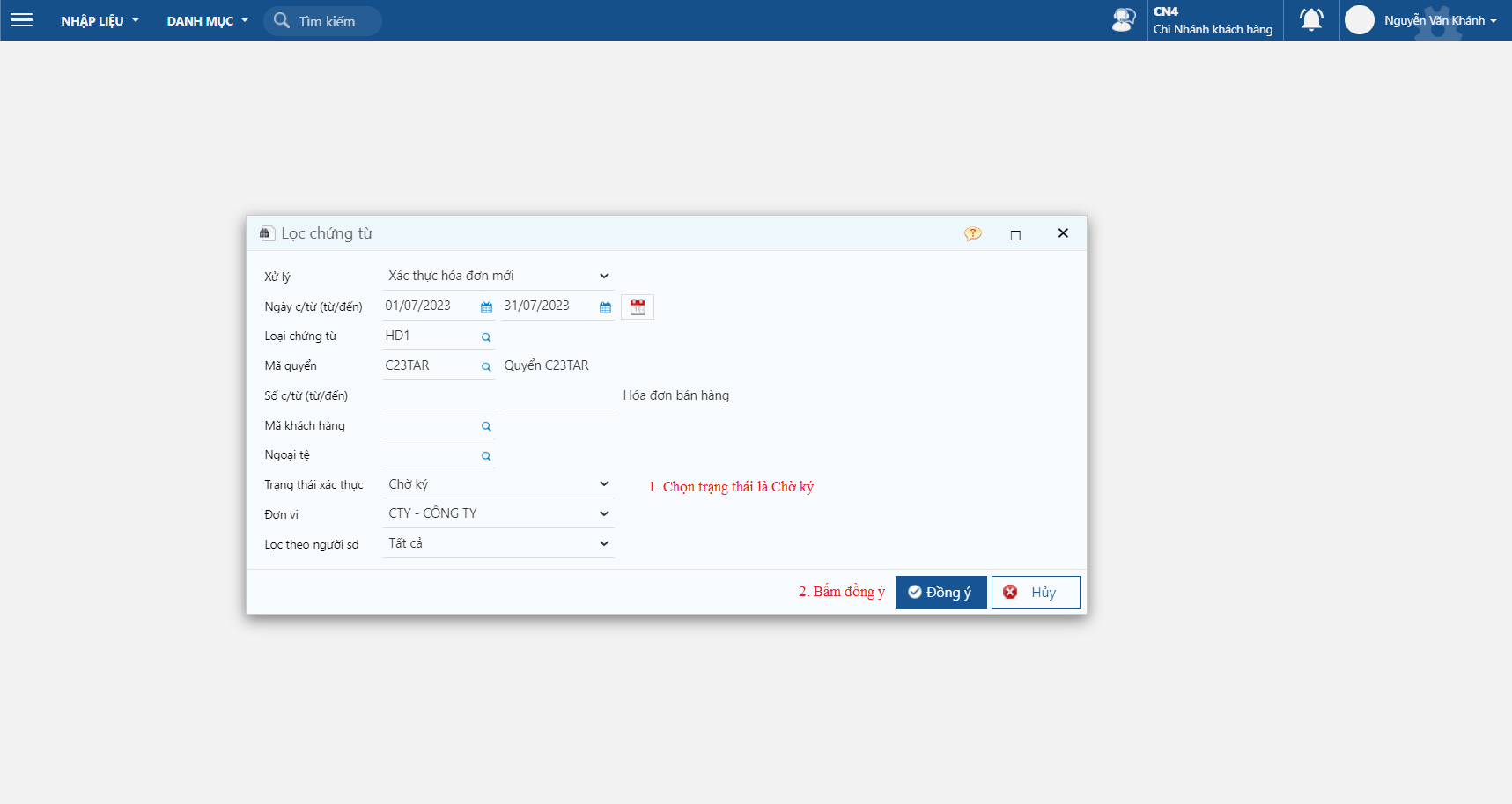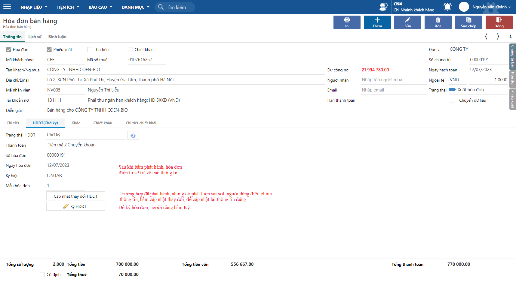 * Đăng nhập vào phần mềm HĐĐT và ký hóa đơn này, sau đó vào hóa đơn trên phần mềm kế toán để cập nhật thông tin đã ký.