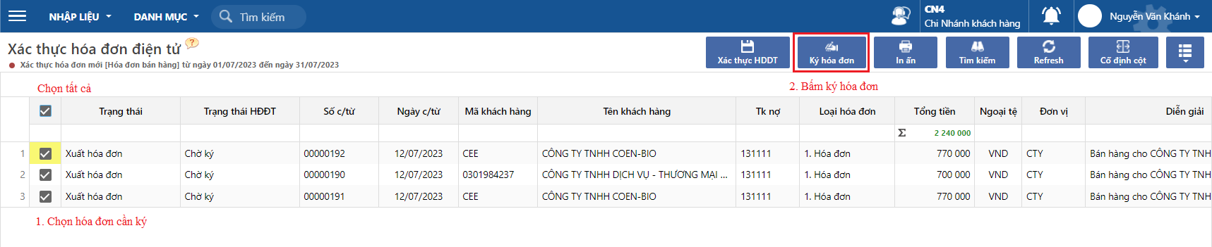 **Bước 3**: Ký các hóa đơn chờ ký. Nếu doanh nghiệp ký bằng HSM và cài đặt khi phát hành là ký luôn thì không thực hiện bước này.