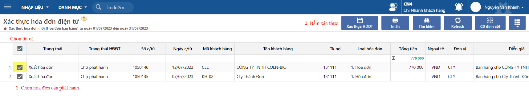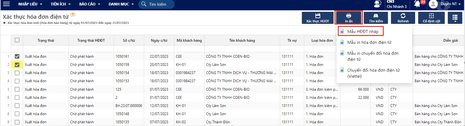 **Bước 2**: Tick chọn 1/ nhiều hóa đơn cần phát hành và bấm **Xác thực HĐĐT**
