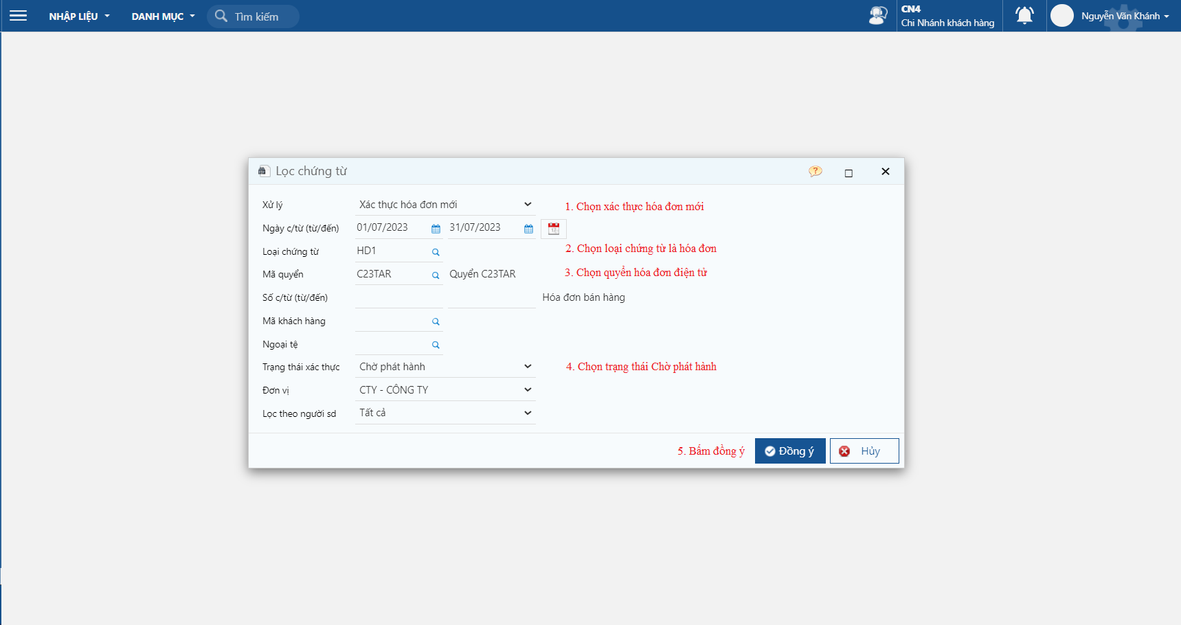 **Bước 1**: Truy cập chức năng phát hành hóa đơn điện tử tại đường dẫn ***Bán hàng/ Nhập liệu/ Hóa đơn điện tử/ Xác thực hóa đơn điện tử,*** lựa chọn Xử lý "Xác thực hóa đơn mới" và các thông tin rồi nhấn Đồng ý.