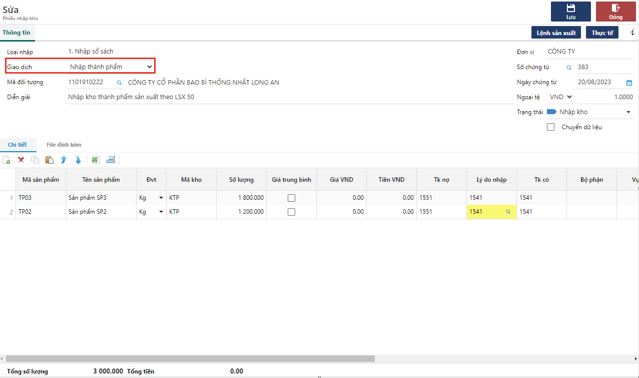 **Bước 3**: Chọn loại giao dịch là **Nhập thành phẩm** và nhập các thông tin sau đó nhấn **Lưu** để lưu phiếu.