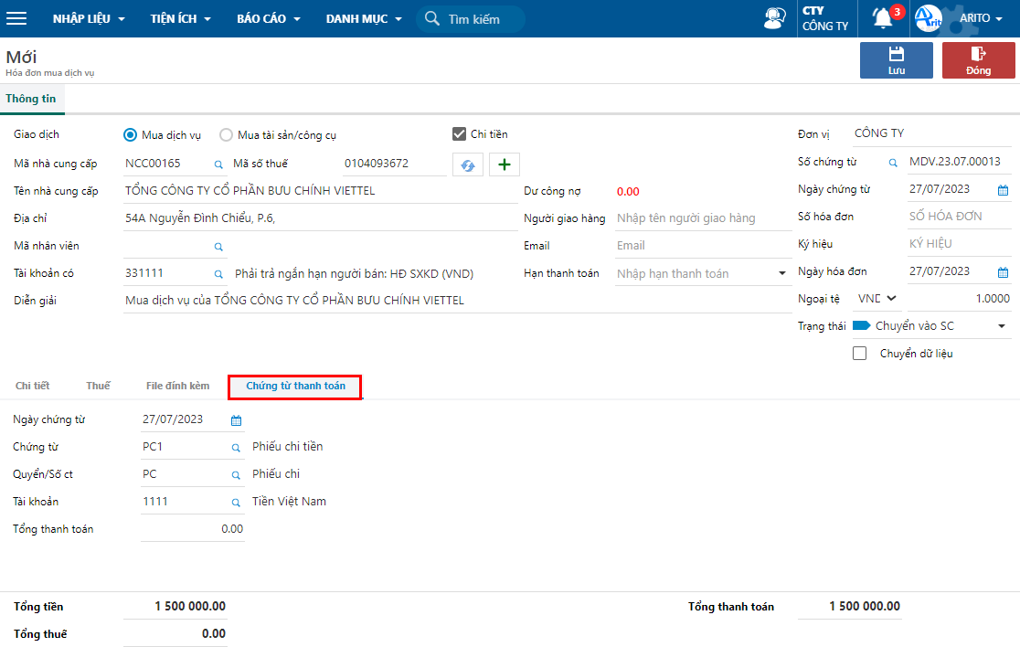 **Bước 5:** Vào tab **Chứng từ thanh toán,** nhập các thông tin trên phiếu và nhấn **Lưu.**
