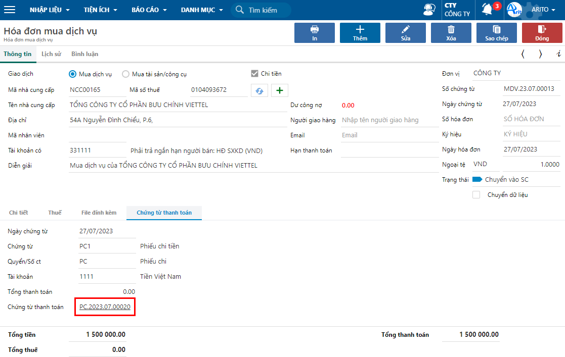 Sau khi Lưu hóa đơn thì sẽ hiện số chứng từ thanh toán ở tab này. Nhấn vào số chứng từ để xem ngay chứng từ thanh toán vừa tạo.