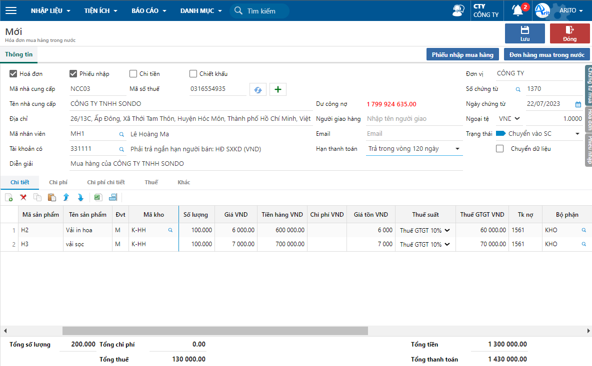 * Khai báo các thông tin chung: mã nhà cung cấp, tài khoản có, số hóa đơn, ngày hóa đơn, ngày hạch toán, trạng thái,…