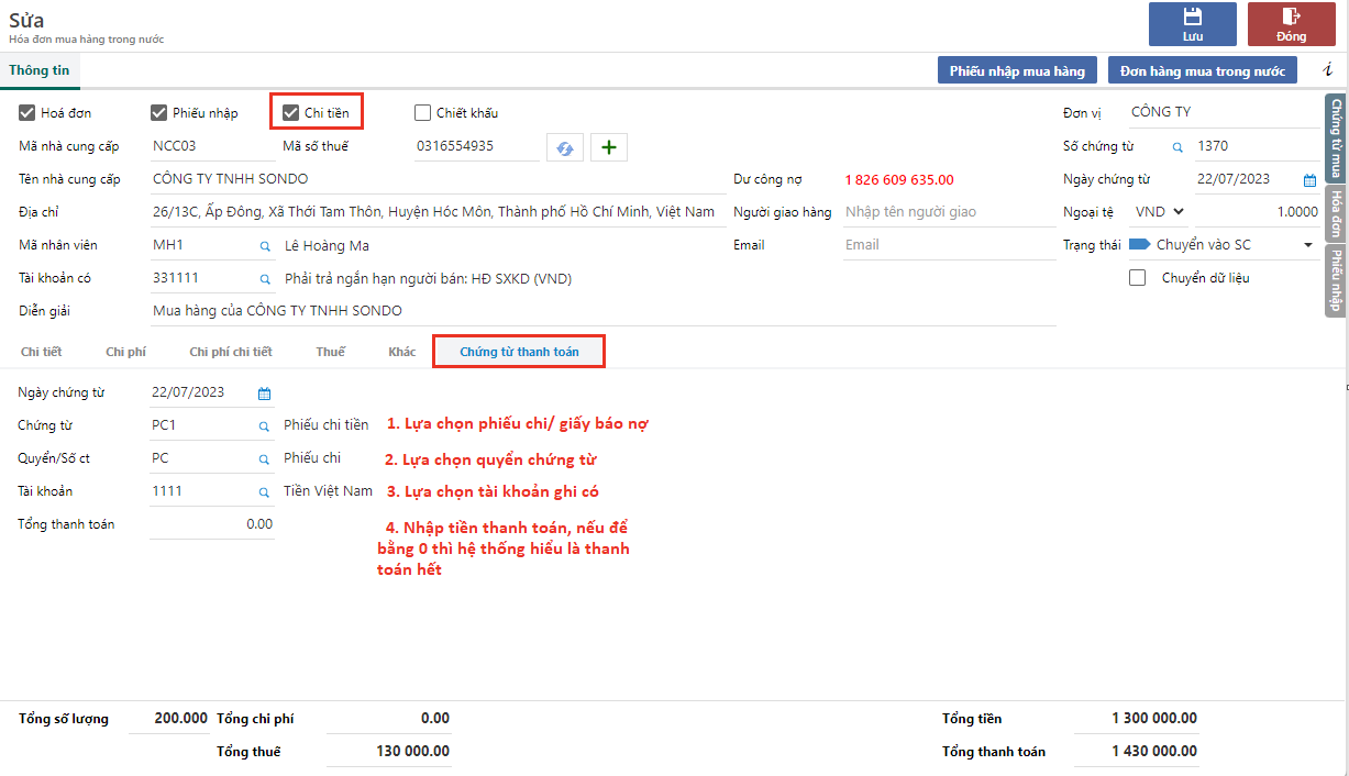 **Bước 3:** Nhập các thông tin trên hóa đơn và tick chọn nút **Chi tiền.**