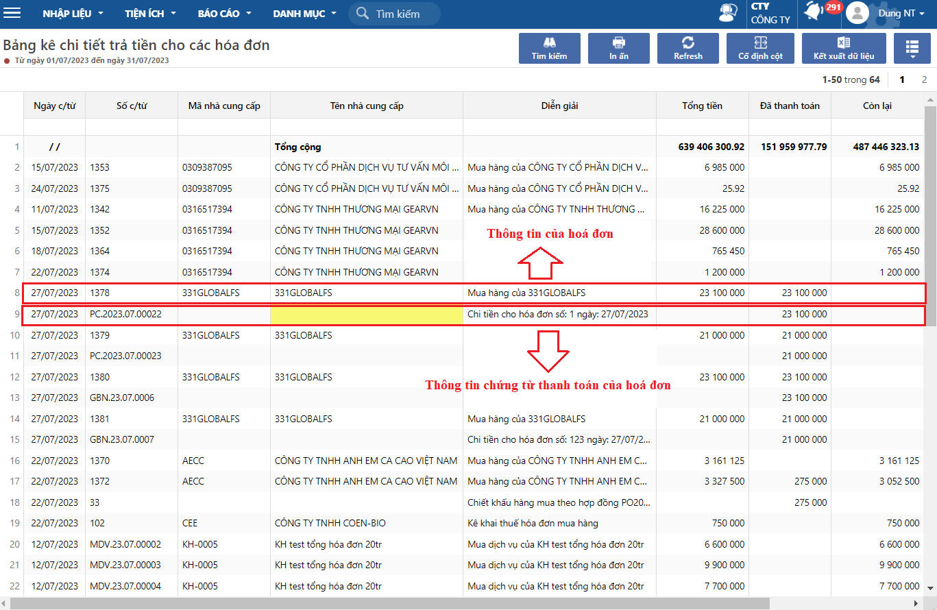 Báo cáo hiển thị chi tiết tình hình thanh toán của hoá đơn, có thể xem được chứng từ thanh toán trên hoá đơn ngay trên màn hình báo cáo.