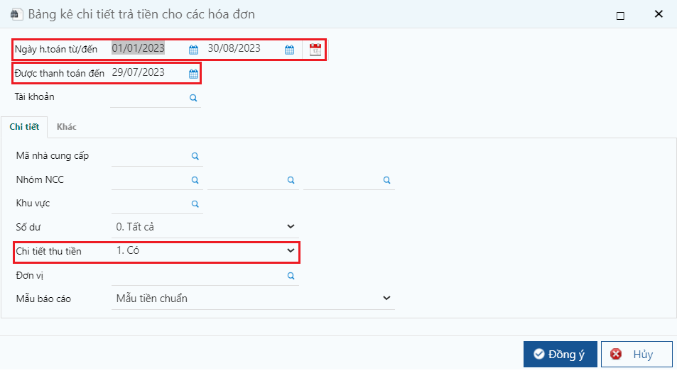 * Được thanh toán đến ngày: dùng để lọc theo ngày của chứng từ thanh toán, ví dụ Hóa đơn ngày 01/04, Phiếu chi ngày 10/04, trường hợp lọc Được thanh toán đến ngày là 06/04, thì cột Thanh toán sẽ lên bằng 0.