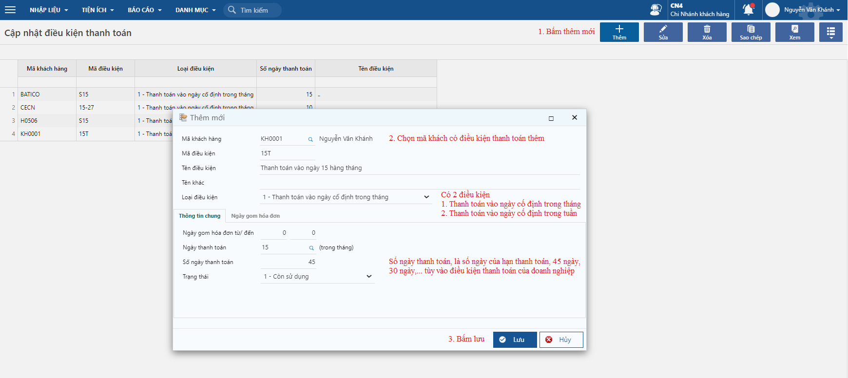 Bước 2: Trên thanh công cụ người dùng bấm **thêm** để thêm mới một điều kiện thanh toán