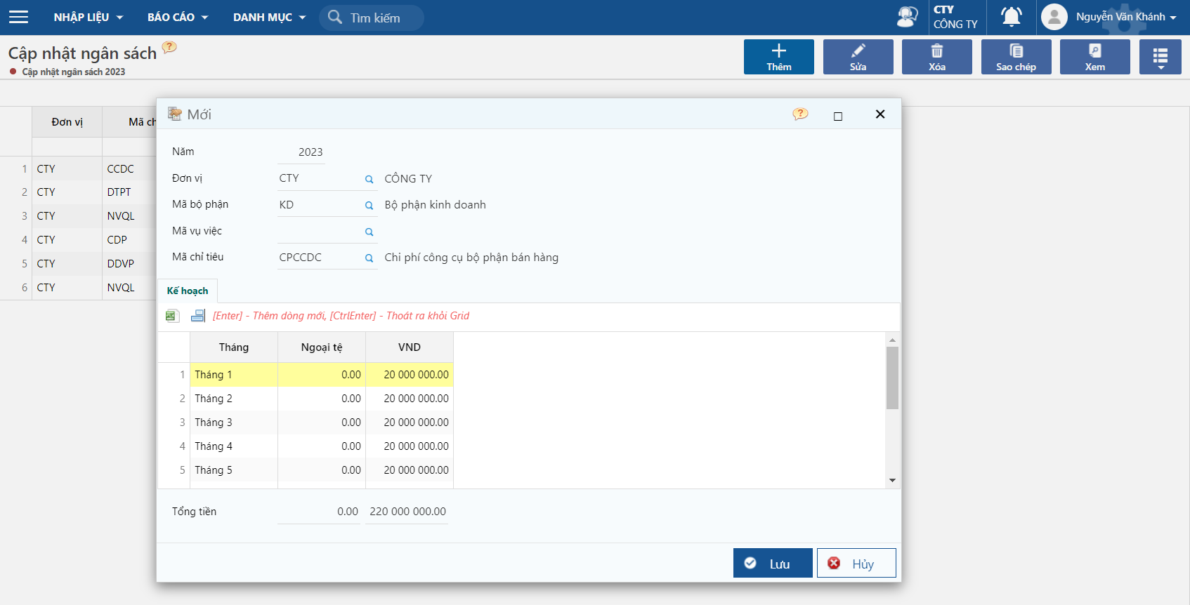 * Khai báo thông tin kế hoạch: khai báo chi tiết chi phí dự trù cho từng tháng, có thể khai báo giá trị ngoại tệ và VND.