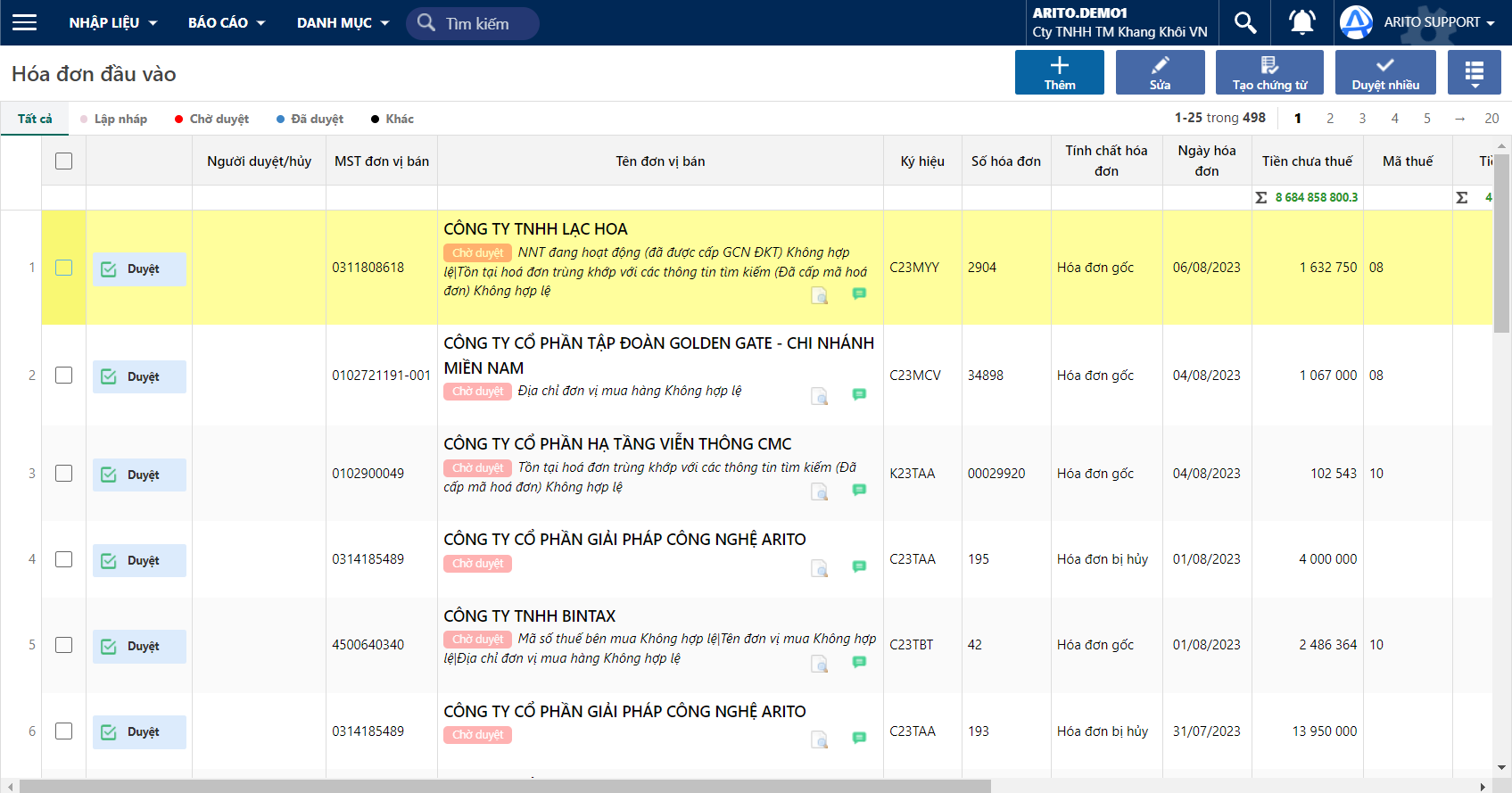 Các hóa đơn được lấy về cập nhật sẽ có trạng thái **Chờ duyệt.**