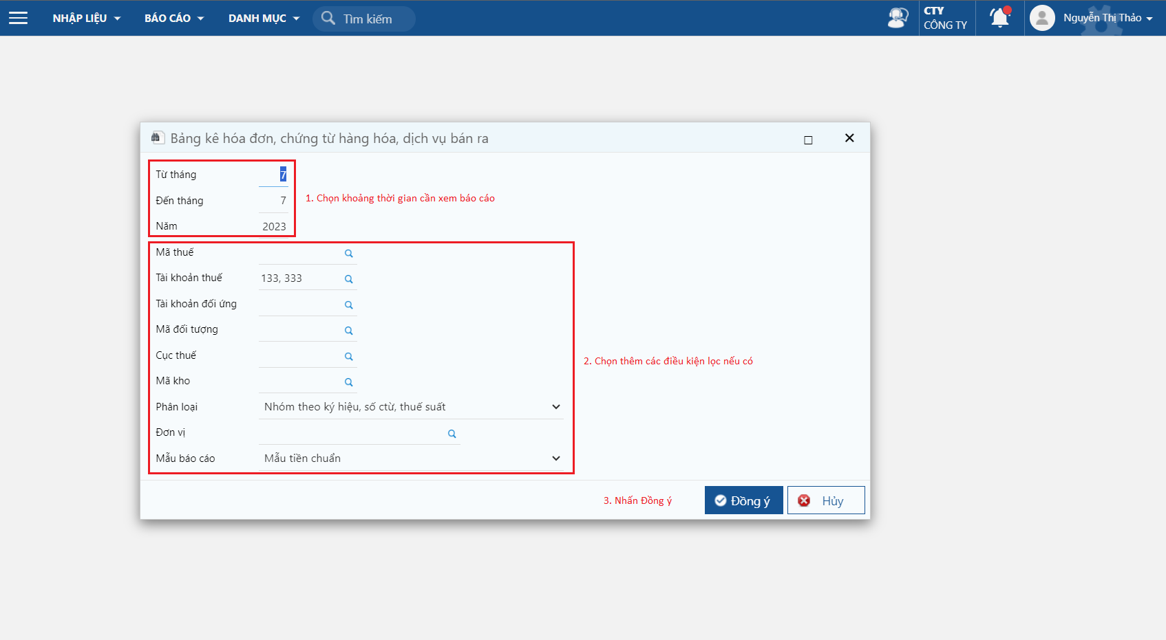 *Đường dẫn: **Thuế/ Báo cáo/ Bảng kê hoá đơn, chứng từ hàng hoá, dịch vụ bán ra***