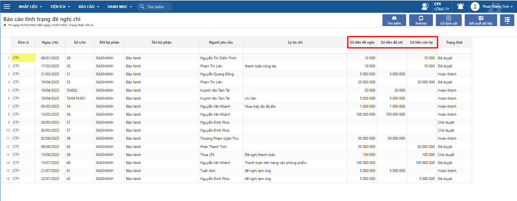 * Báo cáo theo dõi tình trạng của đề nghị chi như số chứng từ, ngày chứng từ, số tiền đề nghị, số tiền kế toán đã chi và số tiền còn lại