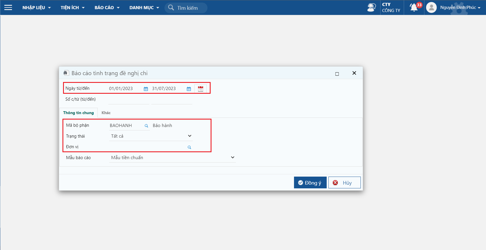 **Bước 2:** Nhập thông tin màn hình điều kiện lọc và nhấn **Đồng ý**