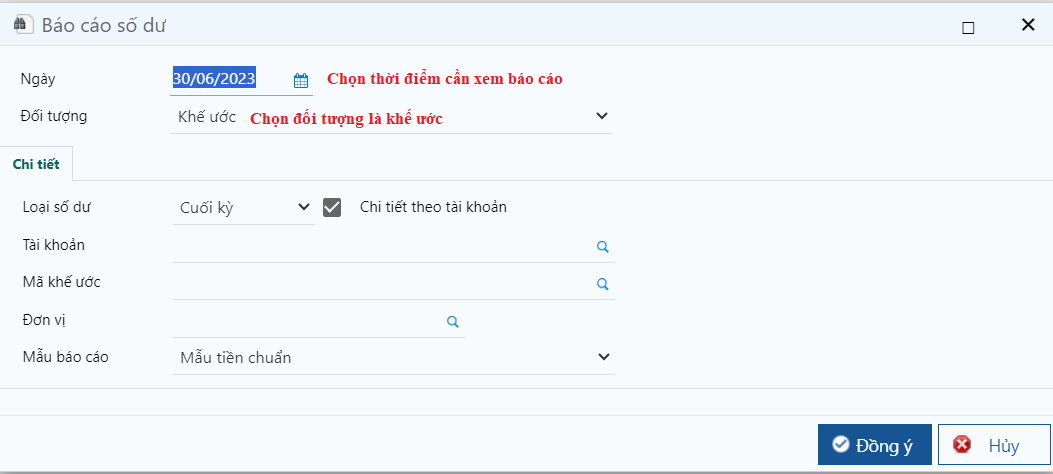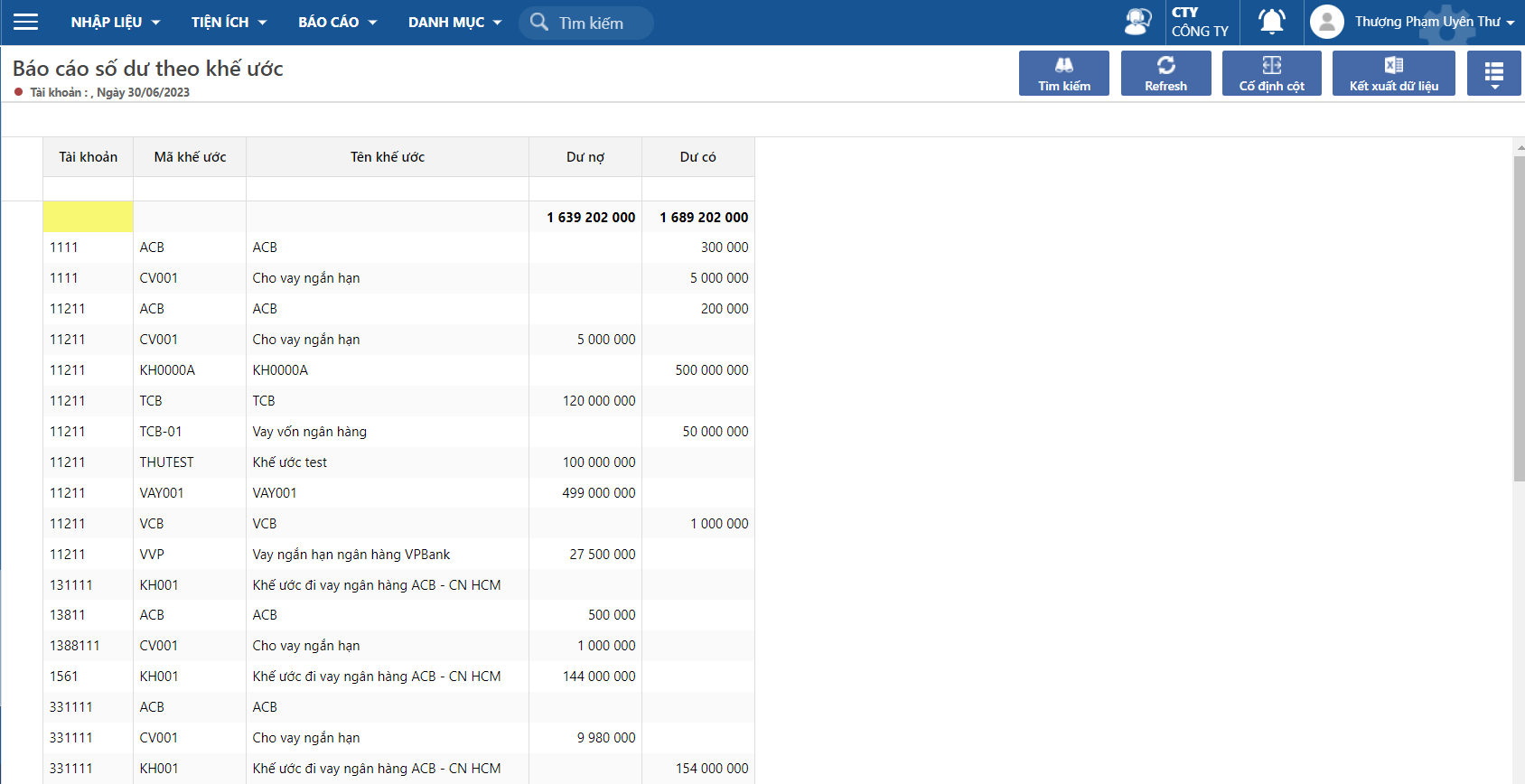 Báo cáo thể hiện số dư đầu kỳ hoặc cuối kỳ theo từng khế ước gắn theo từng tài khoản kế toán.