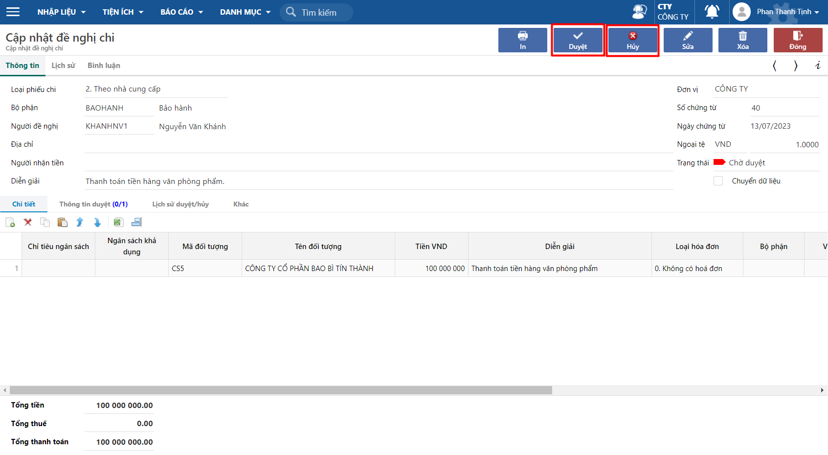 **Bước 3:** Nhấn vào nút **Duyệt** để duyệt phiếu. Trường hợp chứng từ không đạt yêu cầu, nhấn nút **Huỷ** để huỷ duyệt đề nghị.