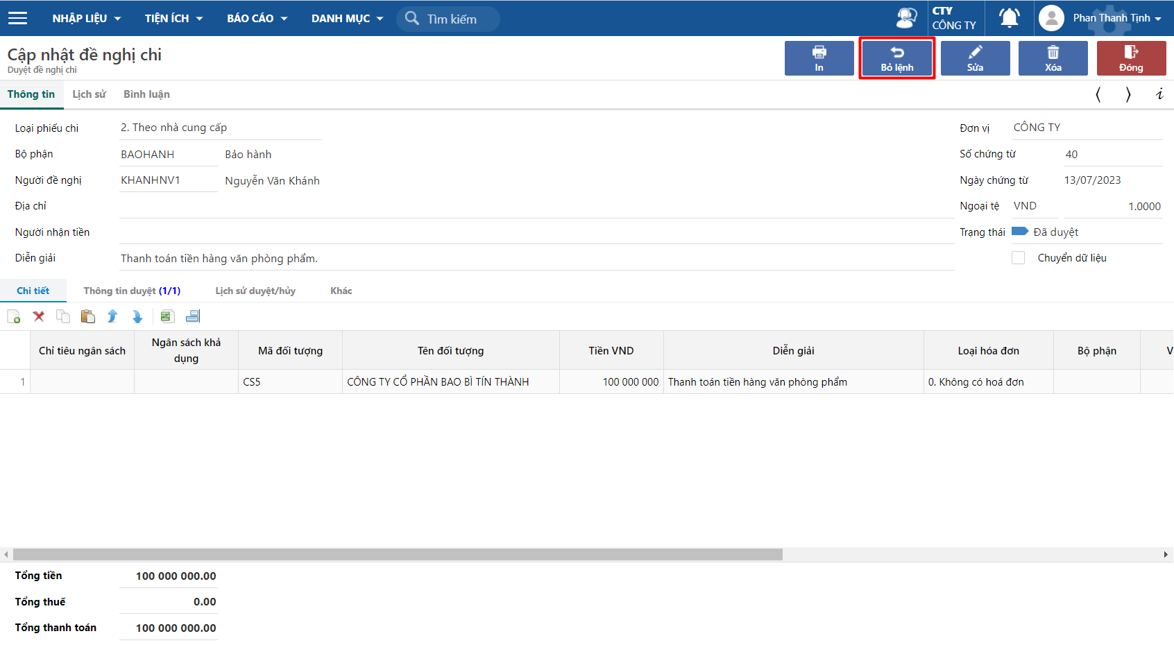 **Bước 2:** Nhấn vào nút **Bỏ lệnh** để bỏ lệnh đã duyệt hoặc lệnh hủy trên phiếu.