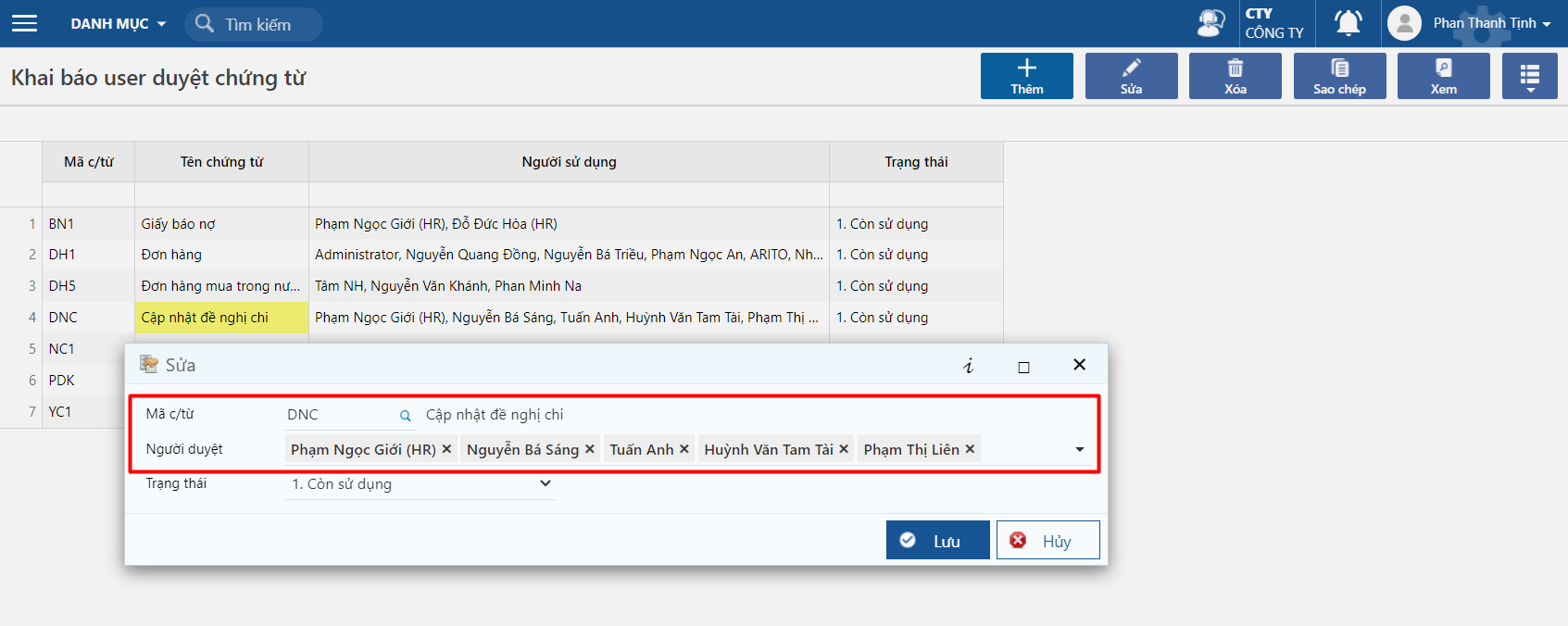 Bước khai báo người duyệt được thao tác trên phần mềm như sau: