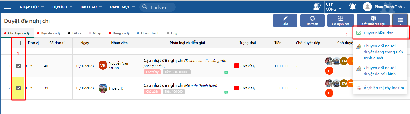 ### Duyệt nhiều phiếu cùng lúc
