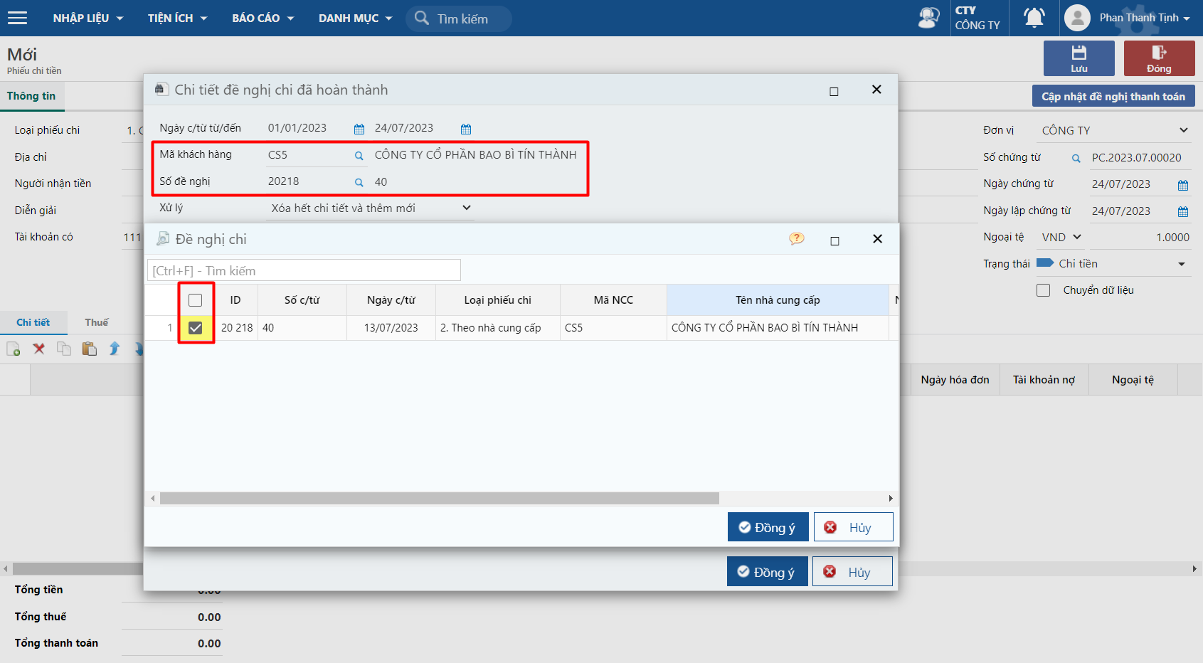 Trên màn hình lấy dữ liệu, cần nhập ngày lọc, mã đối tượng và chọn số phiếu đề nghị chi