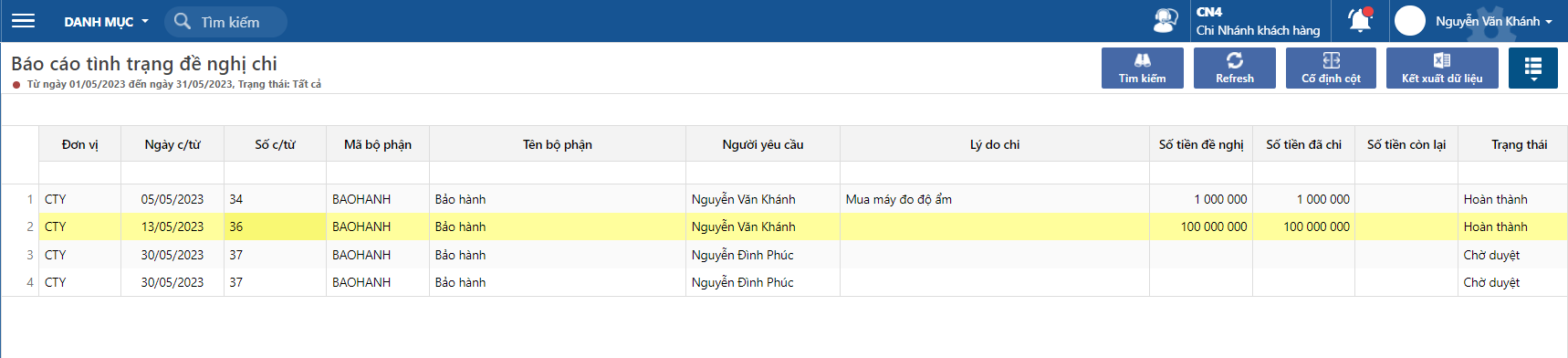 Tại báo cáo đề nghị thanh toán này, người dùng có thể theo dõi tiến độ chi tiền của nghị, bao gồm số tiền mà kế toán đã chi, còn lại bao nhiêu cần chi tiếp, từ đó có thể kiểm soát chi tiền theo đề nghị thanh toán. Cột trạng thái cũng sẽ cung cấp thông tin cho người dùng thông tin, đã duyệt, đang thực hiện chi, và đã hoàn thành chi tiền.