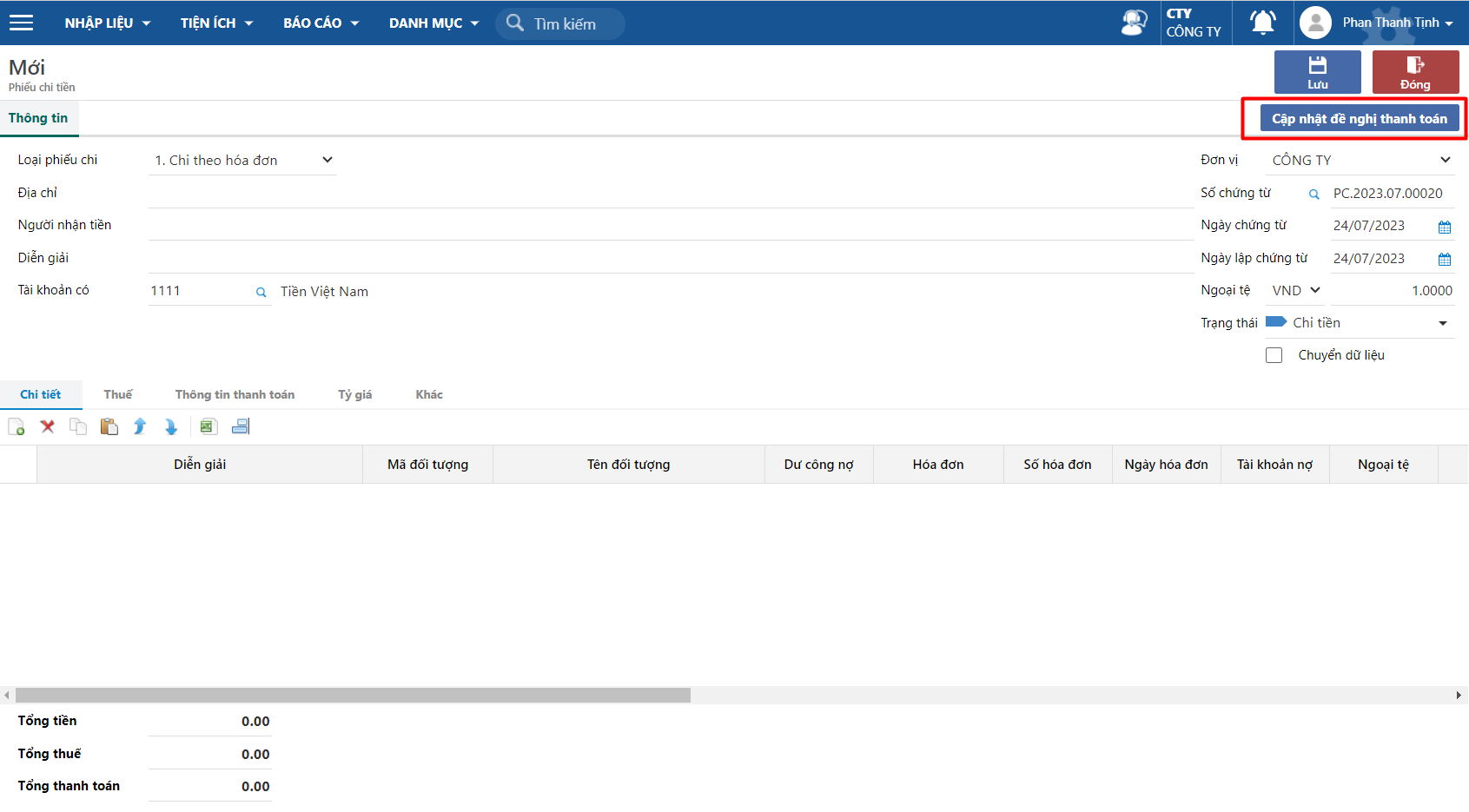 <figure><img src="https://973941128-files.gitbook.io/~/files/v0/b/gitbook-x-prod.appspot.com/o/spaces%2FsSDukYxLOxId9VNLeAck%2Fuploads%2Fgit-blob-f3a5fad142bc0f1a1973a2eba2083089a60acc1d%2FC%E1%BA%ADp%20nh%E1%BA%ADt%20%C4%91%E1%BB%81%20ngh%E1%BB%8B%20chi%202.png?alt=media" alt=""><figcaption><p>Đề nghị thanh toán</p></figcaption></figure>