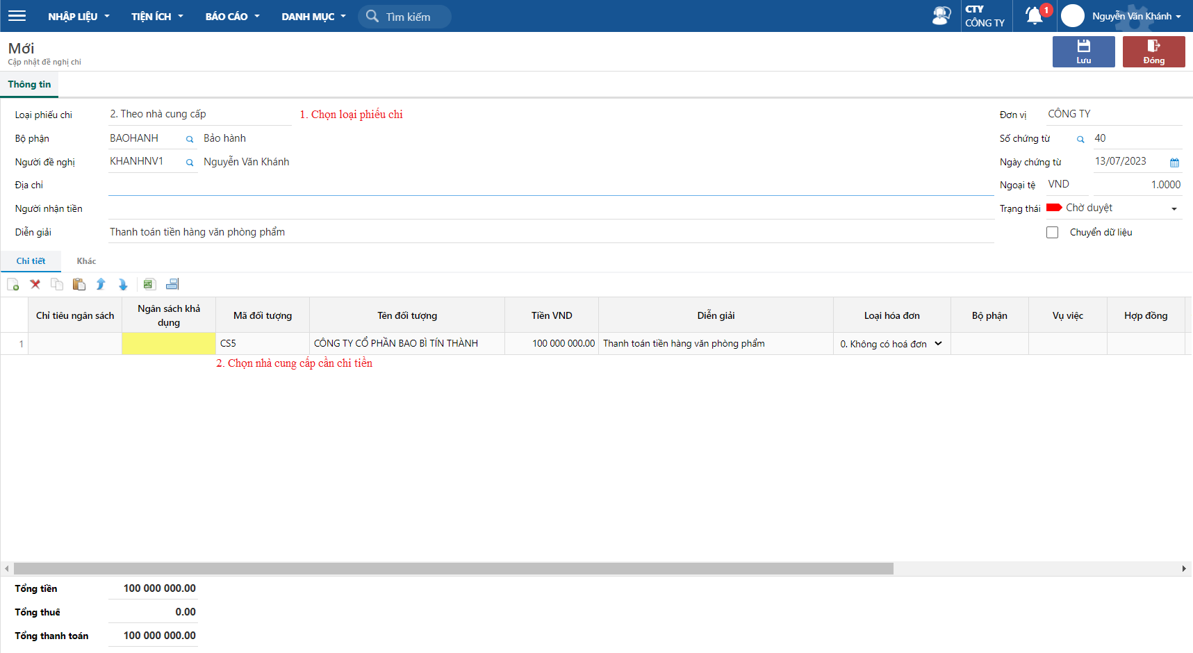 * Đề nghị chi theo nhà cung cấp: dùng trong trường hợp thanh toán tạm ứng cho hợp đồng mua hàng, hoặc tạm ứng trước cho nhà cung cấp, nhân viên.