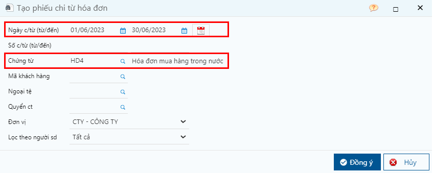 <figure><img src="https://973941128-files.gitbook.io/~/files/v0/b/gitbook-x-prod.appspot.com/o/spaces%2FsSDukYxLOxId9VNLeAck%2Fuploads%2Fgit-blob-1cc064480e18df2cf5cc9d6e4353113b01404671%2Ft%E1%BA%A1o%20phi%E1%BA%BFu%20chi%20t%E1%BB%AB%20h%C3%B3a%20%C4%91%C6%A1n%2002.png?alt=media" alt=""><figcaption><p>Nhập điều kiện lọc hóa đơn cần tạo phiếu chi</p></figcaption></figure>