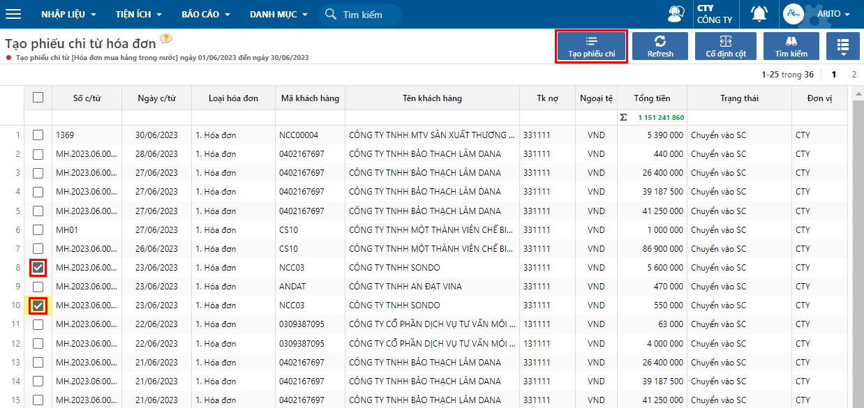 **Bước 3:** Tick chọn hóa đơn muốn tạo phiếu chi và nhấn nút **Tạo phiếu chi.**