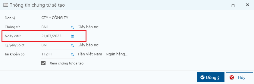 **Bước 4:** Nhập các thông tin trên màn hình thông tin chứng từ sẽ tạo và nhấn **Đồng ý.**