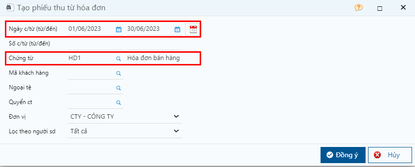 **Bước 2:** Nhập khoản thời gian lọc hóa đơn, chọn loại chứng từ và nhấn **Đồng ý**.