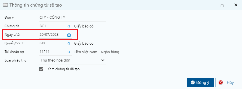 **Bước 4:** Nhập các thông tin trên màn hình thông tin chứng từ sẽ tạo và nhấn **Đồng ý.**
