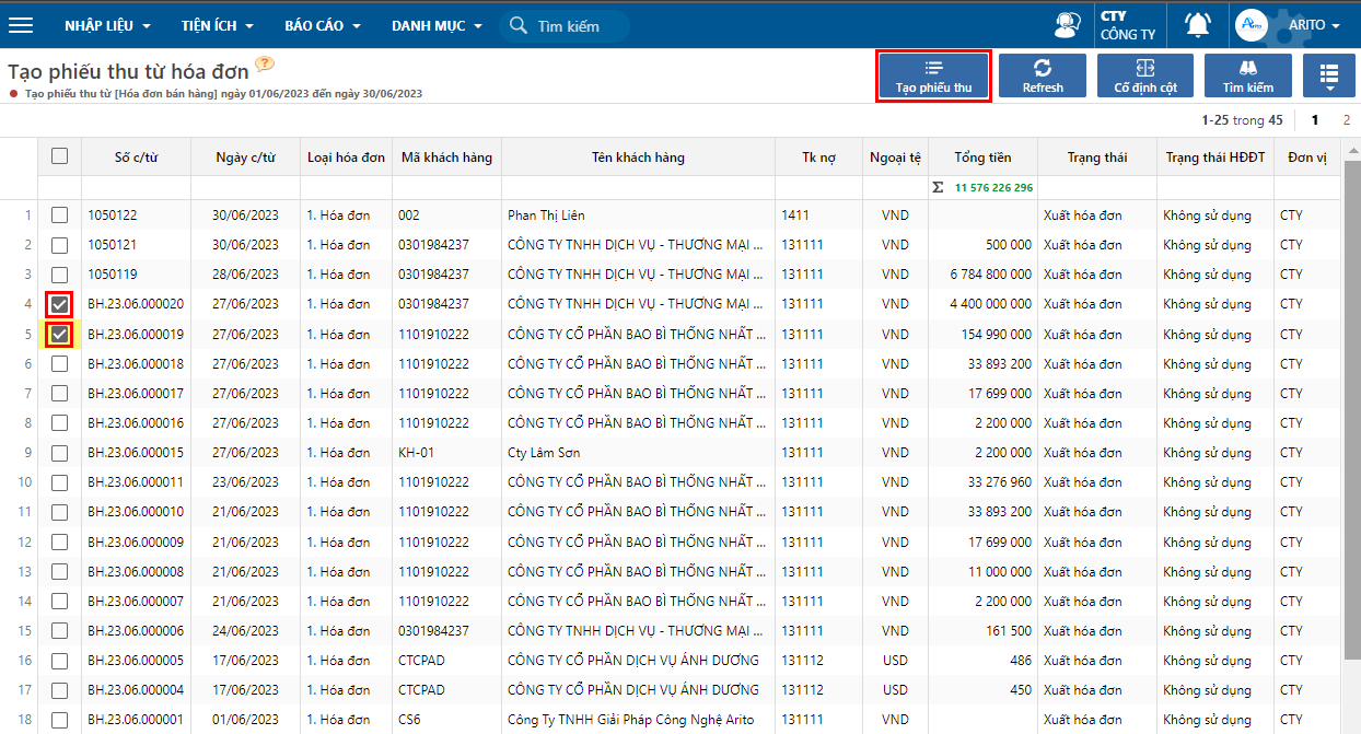 **Bước 3:** Tick chọn hóa đơn muốn tạo phiếu thu và nhấn nút **Tạo phiếu thu.**