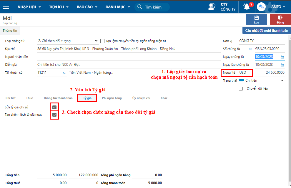 Ví dụ: Phiếu kế toán: Vẫn có xử lý chênh lệch tỷ giá theo dạng tính cuối tháng, tức là lúc Lưu chứng từ sẽ hạch toán không có chênh lệch, cuối tháng chạy tính tỷ giá thì mới phát sinh chênh lệch nhưng không áp lại tỷ giá trên chứng từ.
