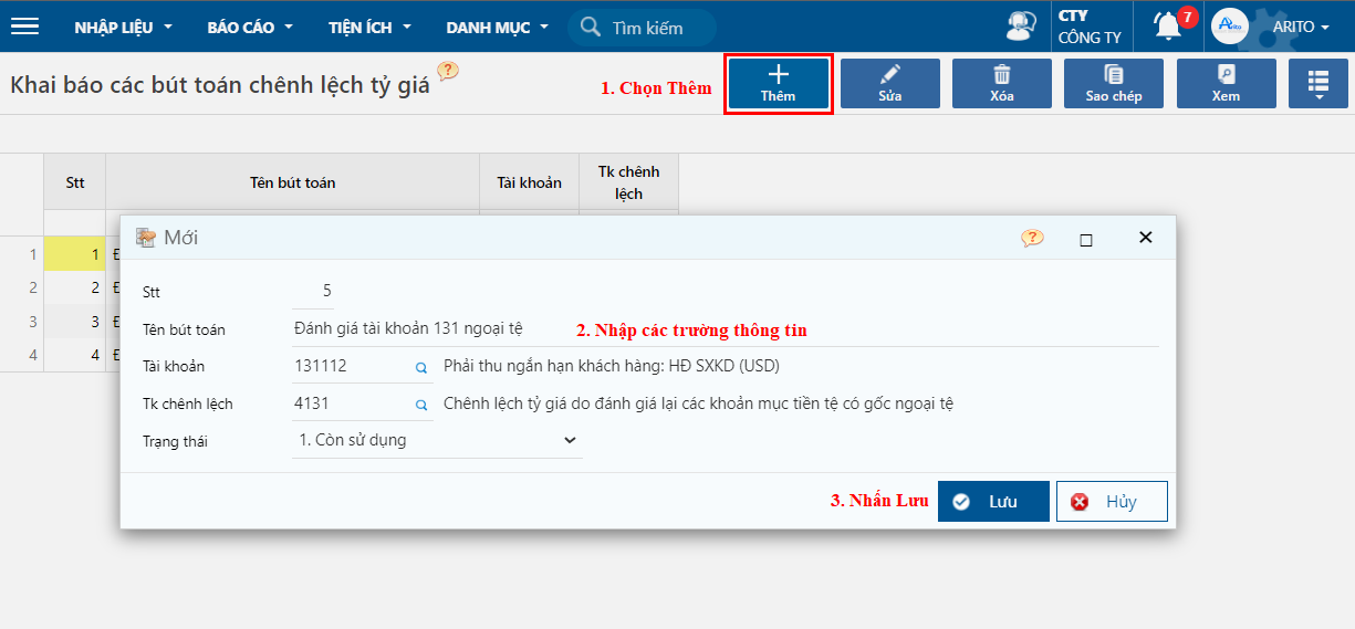 Đường dẫn: ***Tổng hợp/ Nhập liệu/ Khai báo/ Khai báo bút toán chênh lệch tỷ giá***