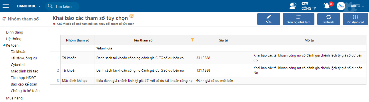 Khai báo tham số tùy chọn: kiểm tra khai báo 3 option như hình để phục vụ việc Đánh giá lại tỷ giá cuối năm.